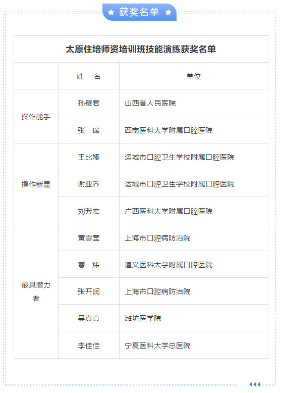 最后選出了操作能手獎、操作新星獎和最具潛力者獎。下午進行口腔醫(yī)師規(guī)范化培訓教學及學習問題答疑,并發(fā)放證書。
