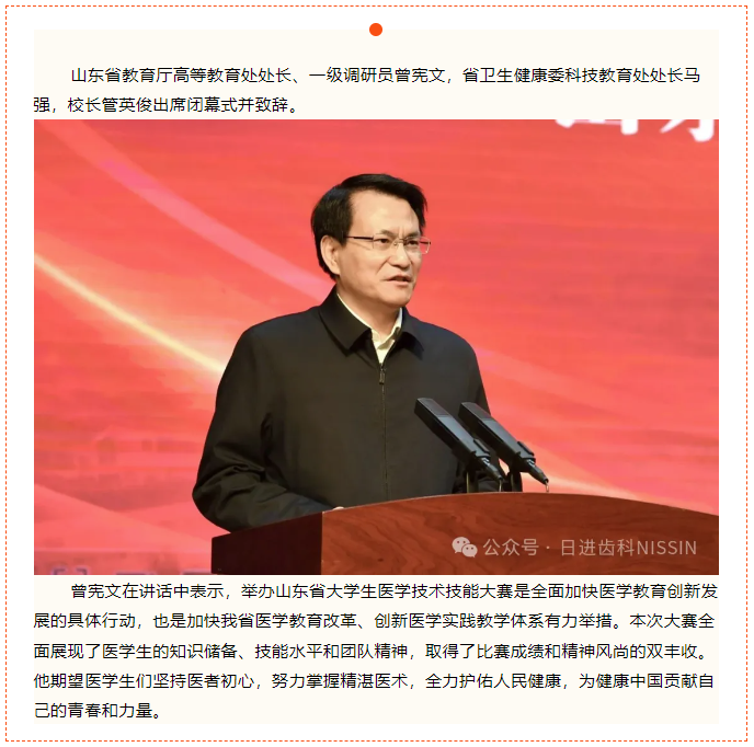 由山東省教育廳、山東省衛(wèi)生健康委員會(huì)主辦,山東第二醫(yī)科大學(xué)承辦,日進(jìn)齒科材料(昆山)有限公司協(xié)辦的“2024年山東省大學(xué)生醫(yī)學(xué)技術(shù)技能大賽(口腔醫(yī)學(xué)專(zhuān)業(yè)賽道)”于2024年3月29日—3月31日在山東第二醫(yī)科大學(xué)如期舉辦。
