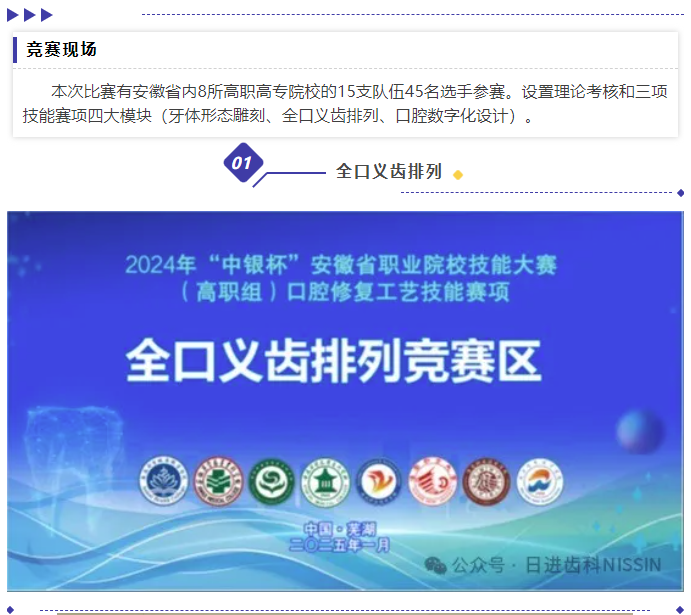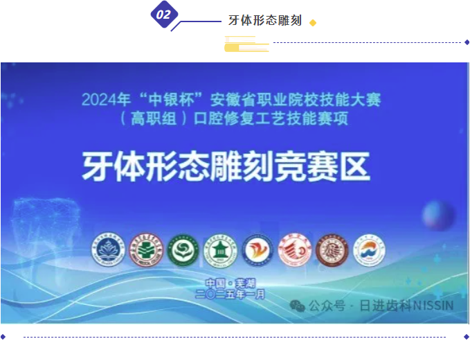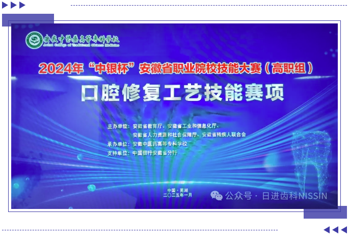 由安徽省教育廳、安徽省工業(yè)與信息化廳、安徽省人力資源與社會保障廳、安徽省殘疾人聯(lián)合會主辦,安徽中醫(yī)藥高等專科學(xué)校承辦,日進(jìn)齒科材料(昆山)有限公司技術(shù)支持的2024年“中銀杯”安徽省職業(yè)院校技能大賽(高職組)口腔修復(fù)工藝技能賽項于2025年1月16日在蕪湖舉辦。
