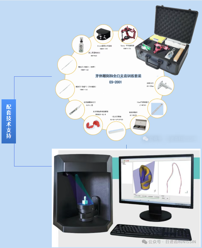 本次大賽由日進齒科材料(昆山)有限公司提供全程配套技術支持和服務。其中全口義齒排列和牙體雕刻模塊全程使用了訓練套裝(由NISSIN提供的牙體雕刻和全口義齒訓練套裝)、牙體雕刻模塊結合了客觀化結果評估系統(由NISSIN提供的牙體雕刻評價及牙科設計系統(TDS-200)),確保了比賽的公平性、公正性、客觀性。